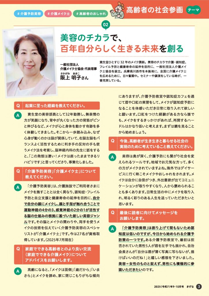 「ひょうご人権ジャーナルきずな」の令和7年9・10月号に掲載されました。「美容のチカラで百年自分らしく生きる未来を創る」というテーマで記事が掲載されています。 前の記事へ8月17日「メイクと脳のかかわり」セミナーを開催します。 次の記事へ医療介護福祉の求人、転職なら【ミカル】に掲載されました